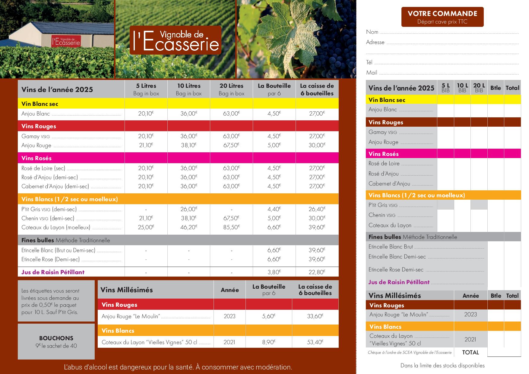 Voici les tarifs 2025 départ cave, HORS TRANSPORT. Pour une livraison directement chez vous, veuillez nous envoyer un mail à vignoble.ecasserie@orange.fr afin que l’on puisse vous donner les frais de transports